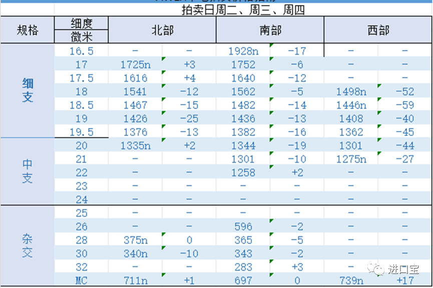 澳大利亚羊毛市场本周小幅波动,收盘较上周变动不大。本周拍卖开始北部和南部市场表现相对稍好,周三疲软下跌;西部市场则从拍卖开始就呈现疲软状态,截止周三收盘几乎是全线下跌。EMI指数收于1144澳分/公斤,比上周下跌4澳分,呈现东热西冷局面。由于上周澳元相对其它币种稍弱,故以非澳元计价价格小涨。