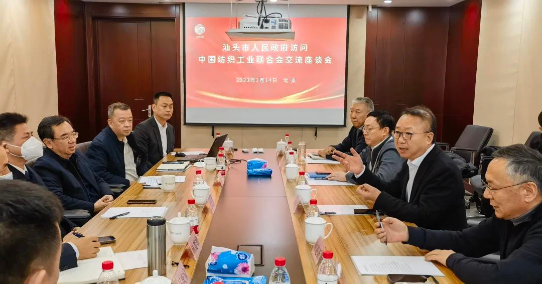 2月14日,汕头市人民政府副市长彭聪恩、副秘书长黄煜生与市工信局、商务局、纺织协会代表等一行十一人到访中国纺织工业联合会,与中国纺织工业联合会会长孙瑞哲,秘书长夏令敏,副会长徐迎新,中国针织工业协会会长林云峰,中国毛纺织行业协会会长刘家强,中国服装设计师协会执行主席杨健,中国纺织工业联合会产业集群工作委员会秘书长张海燕,中国针织工业协会副会长兼秘书长瞿静,中国国际贸易促进委员会纺织行业分会副会长常清,中国服装协会副会长杨晓东等举行了交流座谈。会议由林云峰主持。